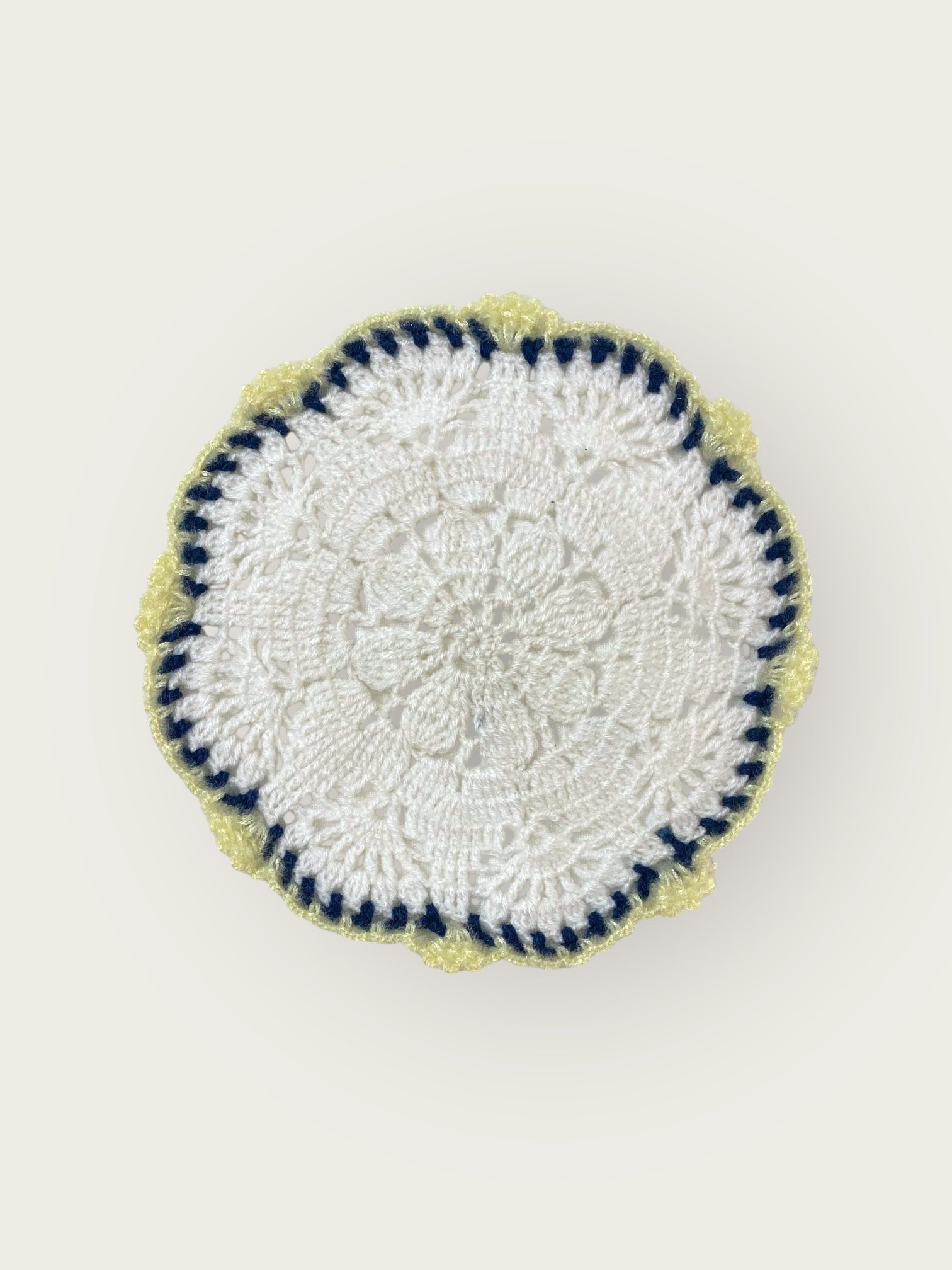 Enhance your decor with this exquisite medium-sized circular crochet doily. Handmade from high-quality wool, it features an intricate design with a beautifully contrasting base color and border. Perfect for adding a touch of elegance to tables, shelves, or dressers, this timeless piece showcases the artistry of fine crochet work.