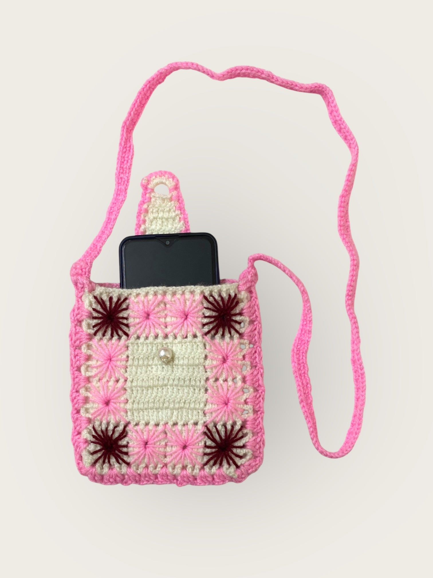 Make your morning or evening walks more enjoyable and relaxed with this small square crochet sling pouch, perfect for carrying your mobile phone. Handmade from high-quality wool using intricate crochet techniques, it features a long sling for effortless wear. Lightweight, durable, and charming, it’s the ideal blend of convenience and elegance!