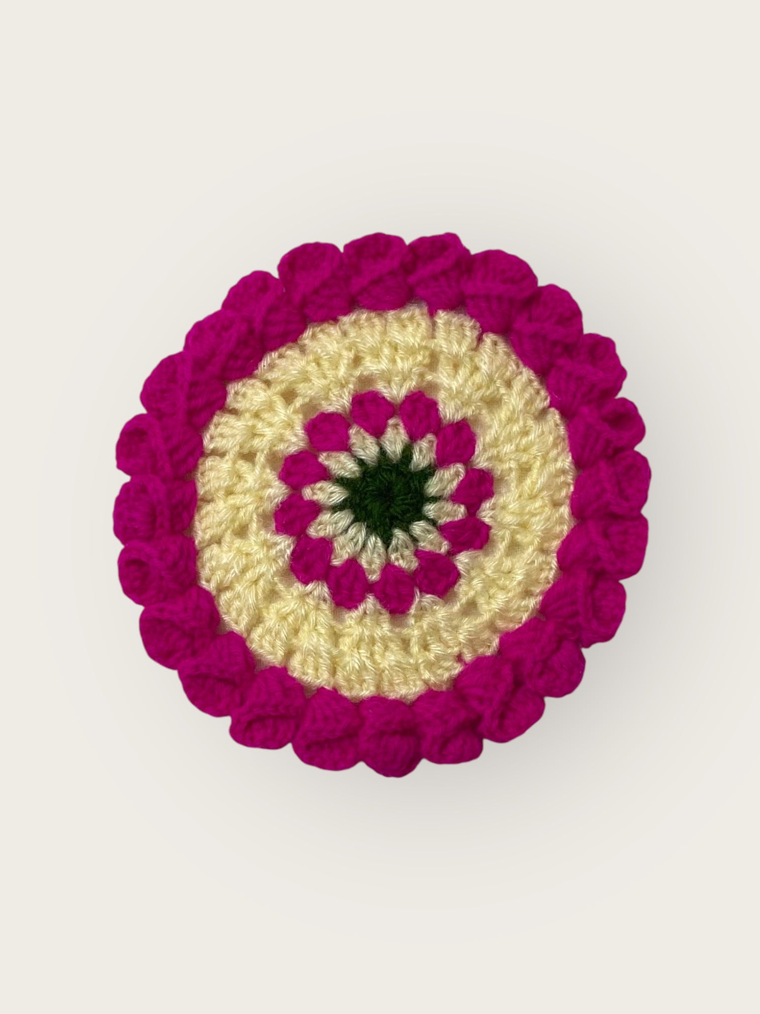 Add elegance to your table with this beautiful small-sized circular crochet coaster featuring a unique layered pattern design. Handmade from high-quality wool, it showcases intricate craftsmanship, offering both style and functionality. Soft, durable, and absorbent, it's perfect for everyday use or as a thoughtful gift!